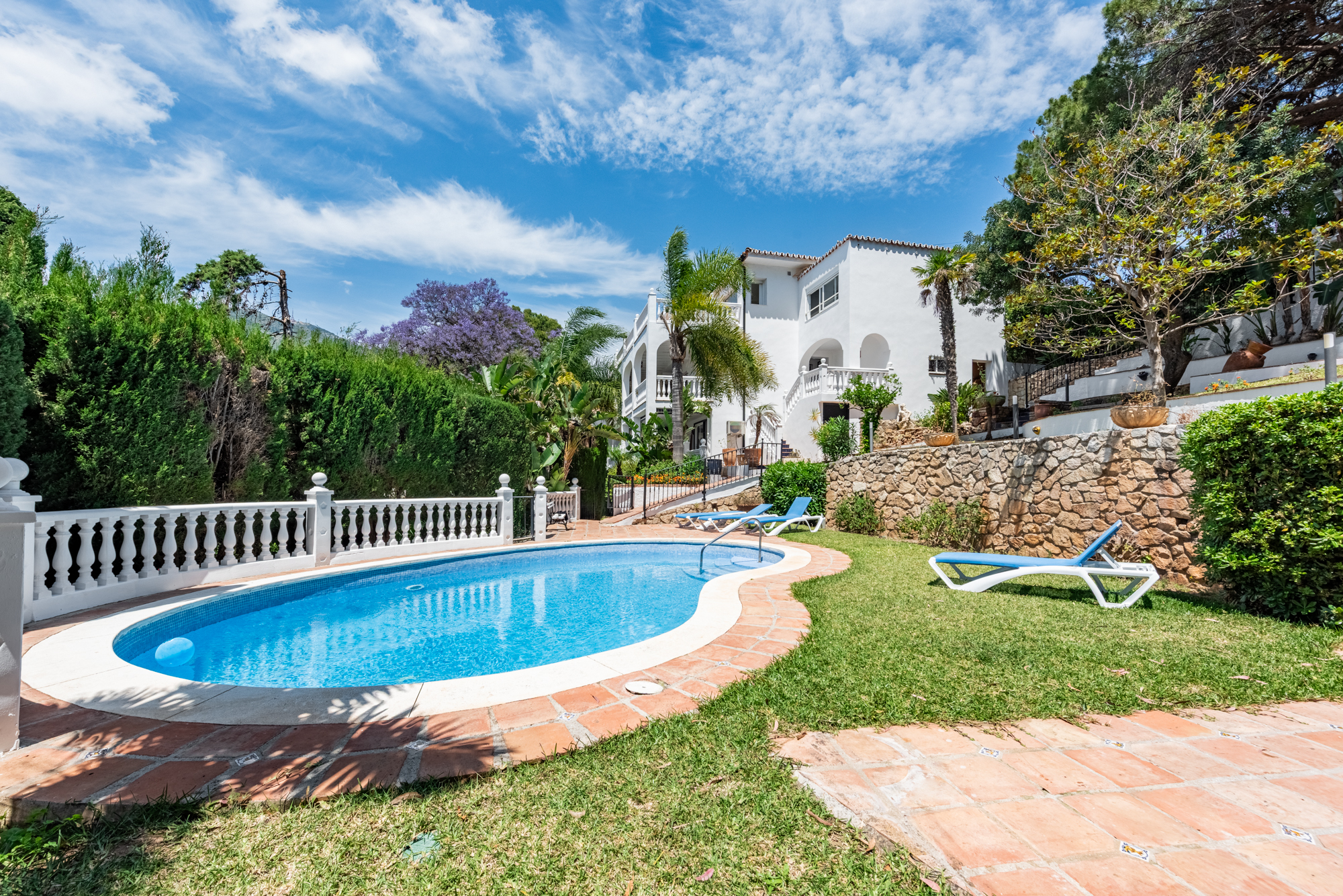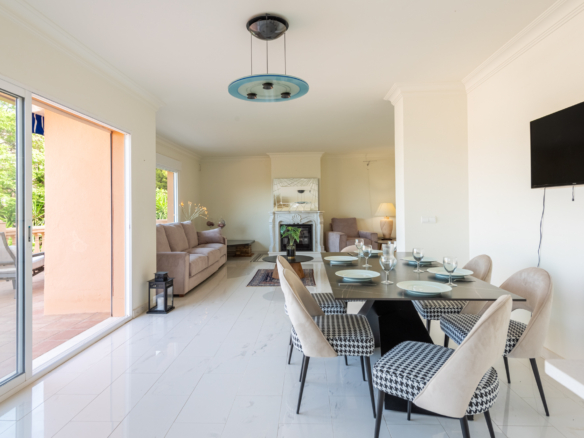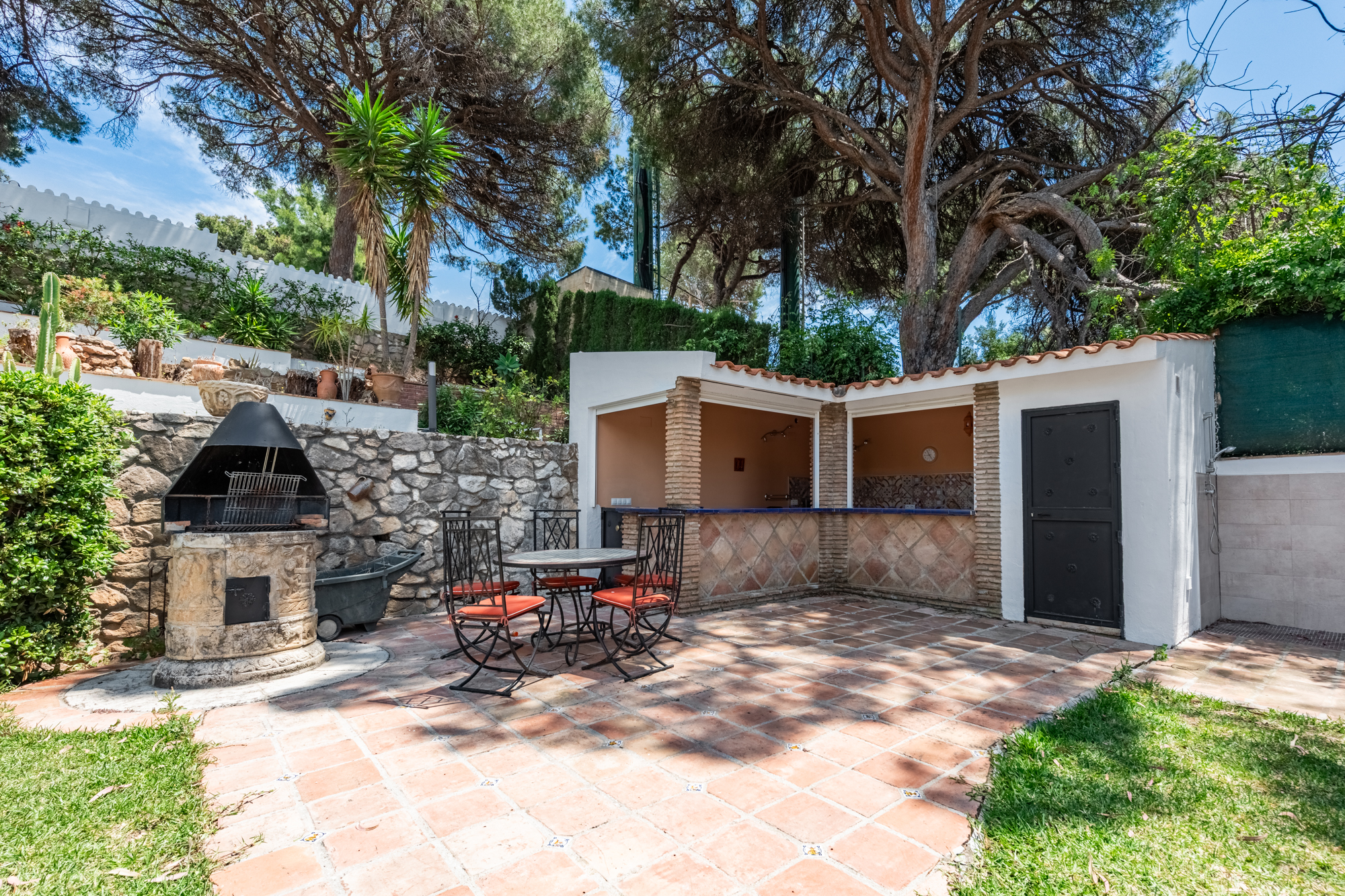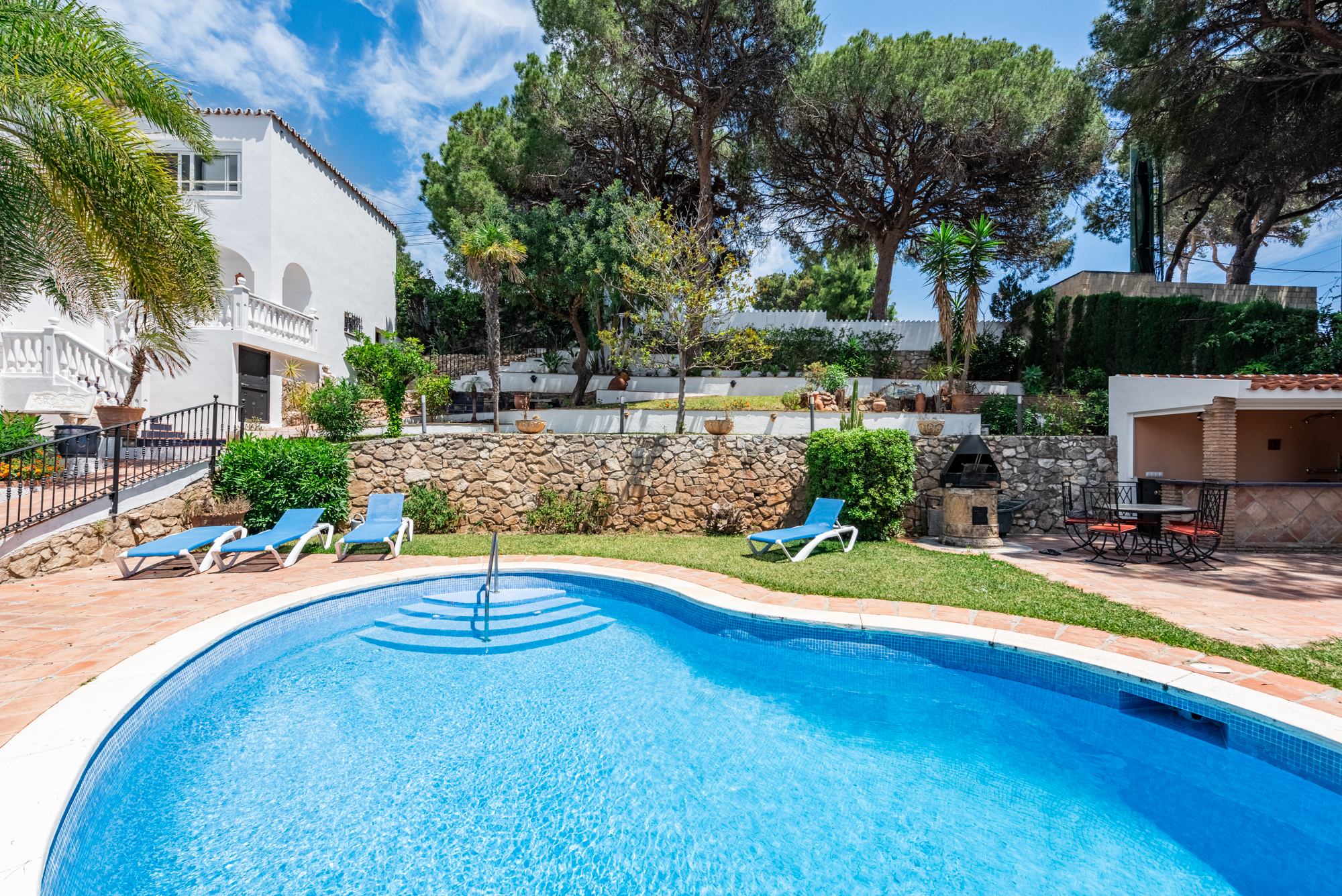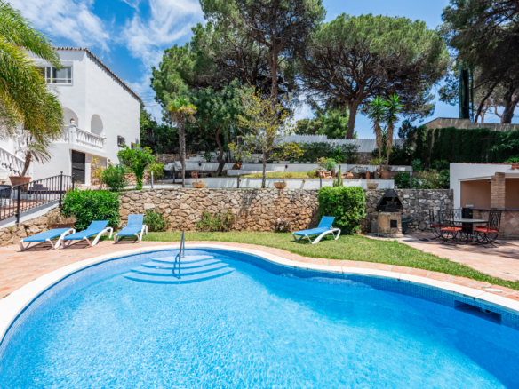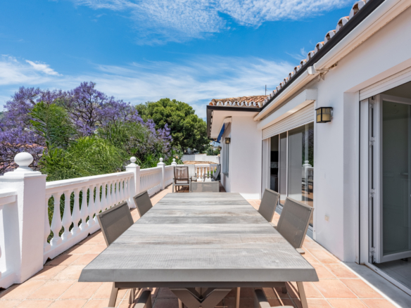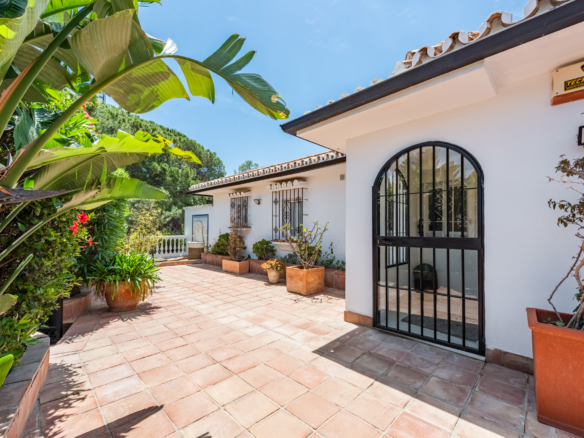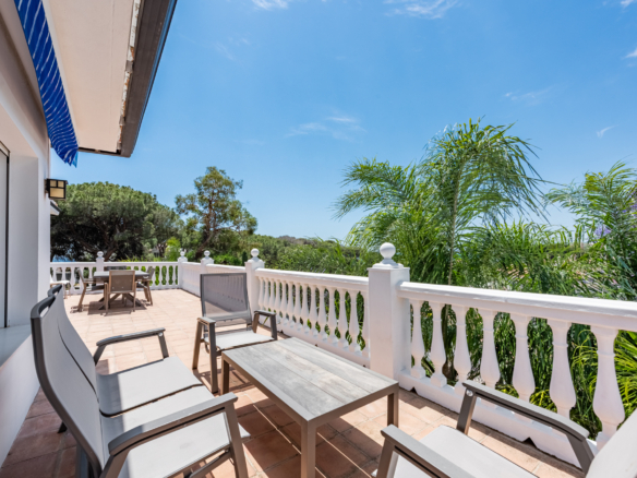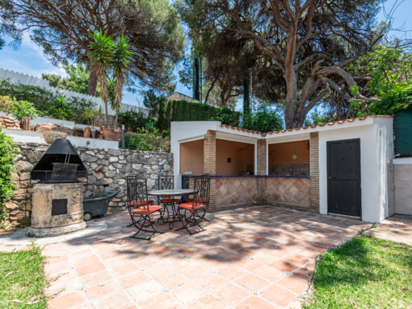 The villa offers five spacious bedrooms and four bathrooms, providing ample room for family and guests. A bright and inviting living space flows effortlessly to multiple terraces, where you can enjoy the sun or relax in the shade throughout the day. The lush green garden surrounds a private swimming pool, creating your own serene summer oasis, while an outdoor kitchen and bar make it effortless to entertain under the Andalusian sun.
